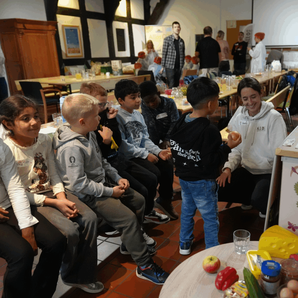 Auf dem Hof angekommen, starteten die Kids mit einem großen gemeinsamen Frühstück. Hier konnten sie sich in aller Ruhe durch unser vielfältiges Allos Sortiment probieren und dazu eine bunte Auswahl an Obst und Gemüse genießen.
